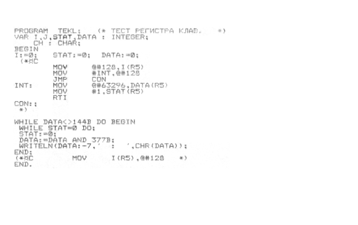 Суть его в том, чтобы назначить свой обработчик прерывания клавиатуры. В этом прерывании считывался код клавиши из контроллера клавиатуры и помещался в глобальную переменную (DATA). Также устанавливался признак, что какая-то клавиша была нажата (STAT).