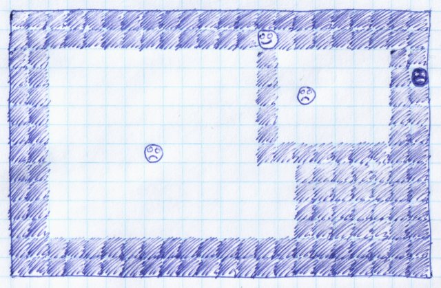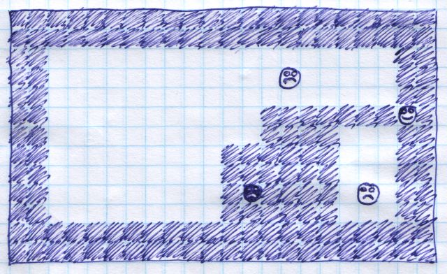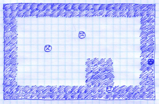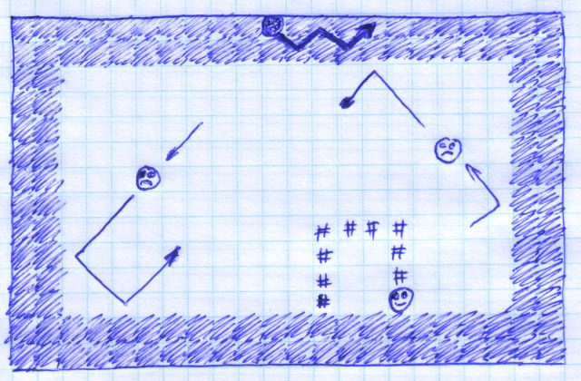 Скорость перемещения по клеткам для всех персонажей одинаковая. Главный персонаж может перемещаться только по горизонтали или вертикали. Враждебные персонажи перемещаются только по диагонали.