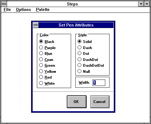 Теперь, когда вы оснастили программу Steps созданным из ресурса диалоговым блоком, нужно научиться взаимодействовать с этим диалоговым блоком. Сначала вы создадите объект, инкапсулирующий все характеристики окна пера, затем используете диалоговый блок для установки и изменения этих характеристик.     В данной главе описаны следующие шаги: