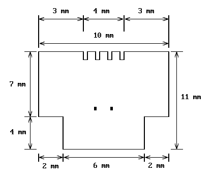 На широкой грани на расстоянии 3 мм от краев прорезаются четыре щели шириной 0.5 мм и глубиной 1..1.5 мм. Расстояние между соседними щелями 0.6 мм. Удобно наметить щели, вставив заготовку широкой стороной в гнездо телефона/модема и сделав ею несколько движений вдоль контактов гнезда, которые оставят на мягкой пластмассе заметные следы. Я использовал для прорезания щелей металлическую линейку толщиной 0.5 мм, сделав на ее ребре легкую насечку ножом и сняв заусенцы надфилем.