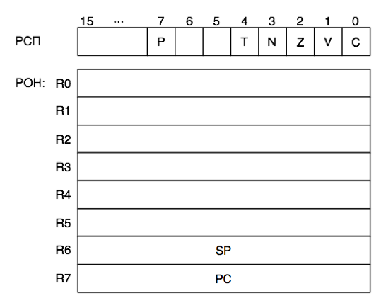 Микропроцессор К1801ВМ1 имеет 8 регистров общего назначения (РОН) и регистр слова состояния процессора (РСП). Все регистры 16-разрядные.