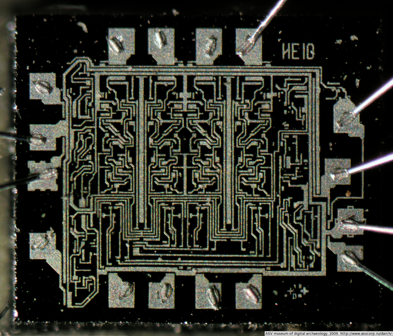 Микросхема, кристалл которой изображён на фотографии была повреждена - отвалилась керамическая крышка. Коцки на кристалле образовались из-за того, что микросхема долгое время хранилась без керамической крышки. Контакты оторваны по той же самой причине.