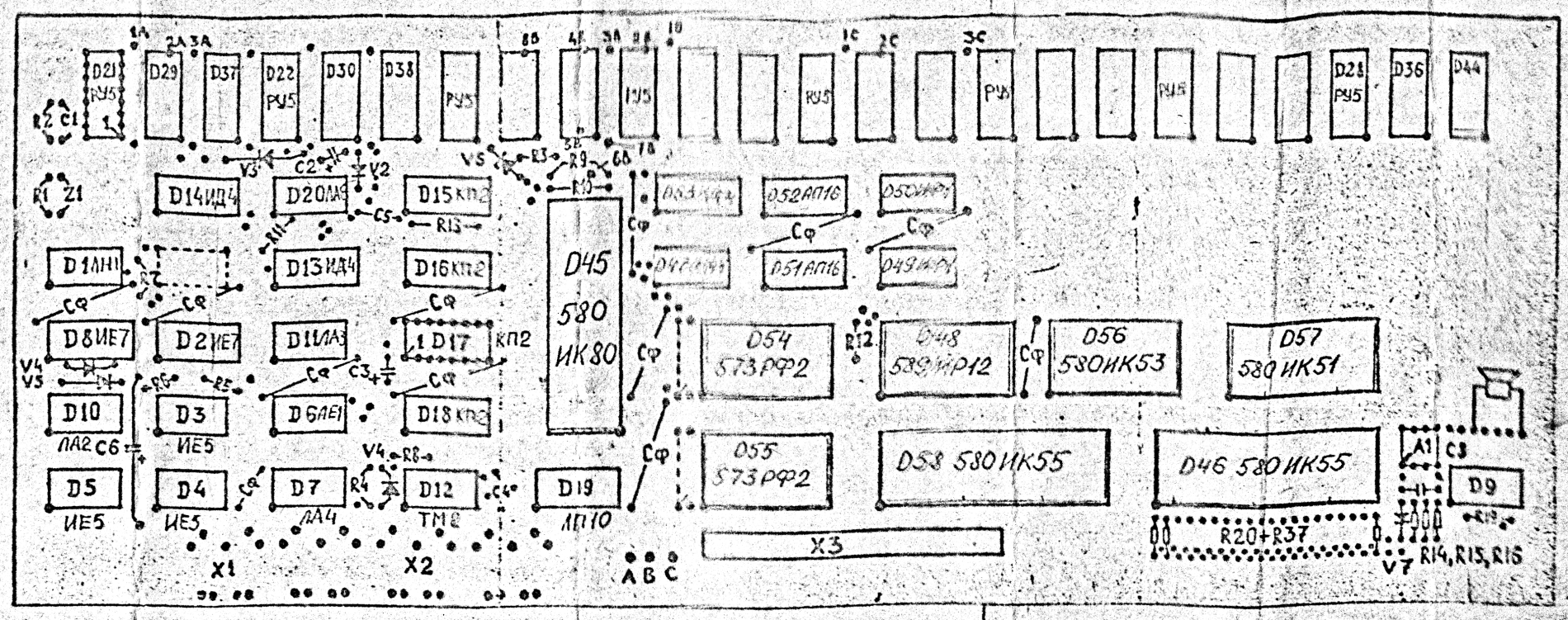 В отличии от оригинальной схемы, опубликованной в журнале Моделист-Конструктор, в этой плате была разводка под микросхемы КР565РУ6.