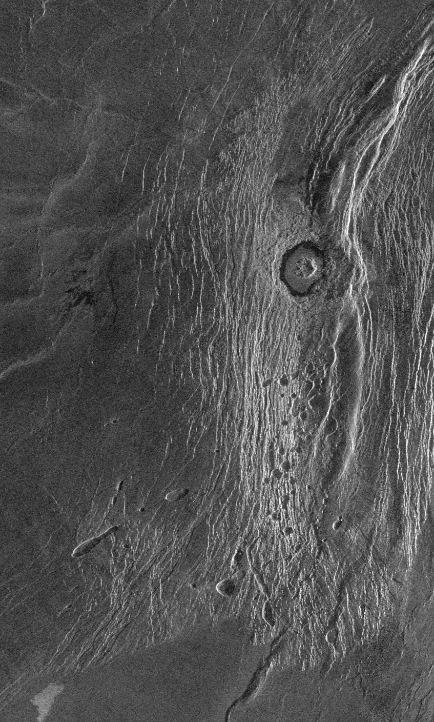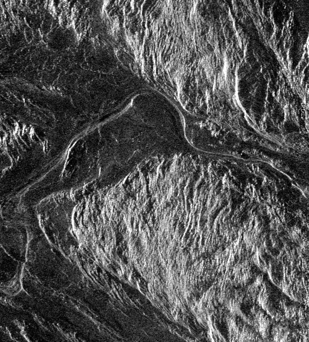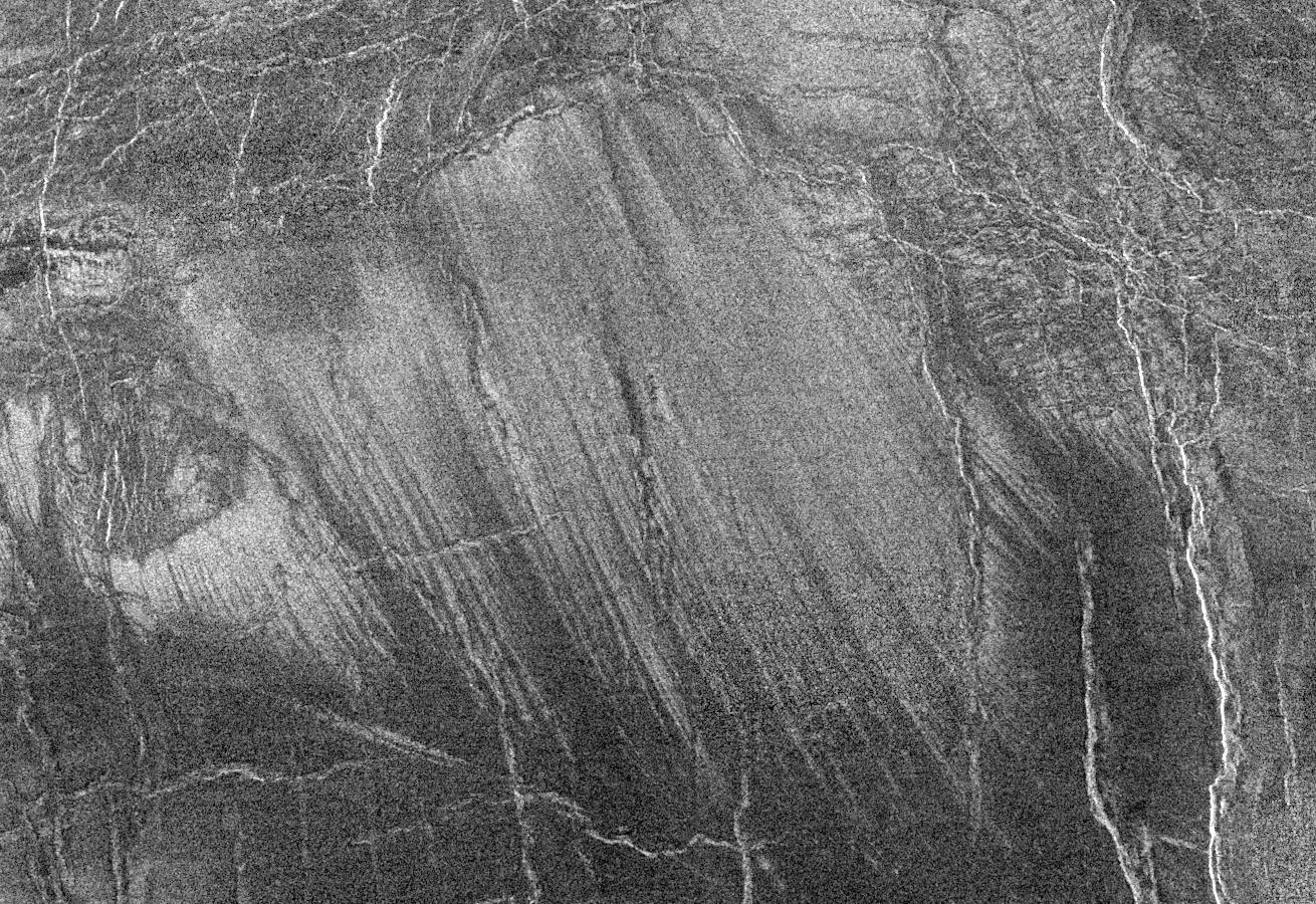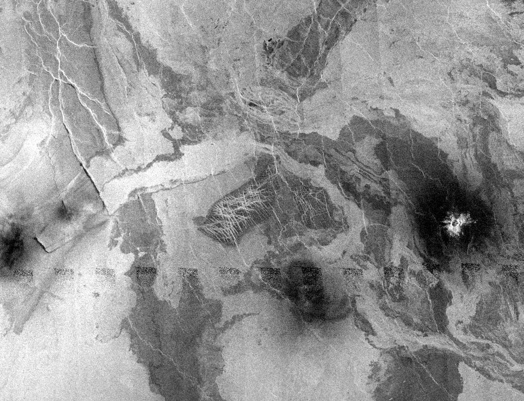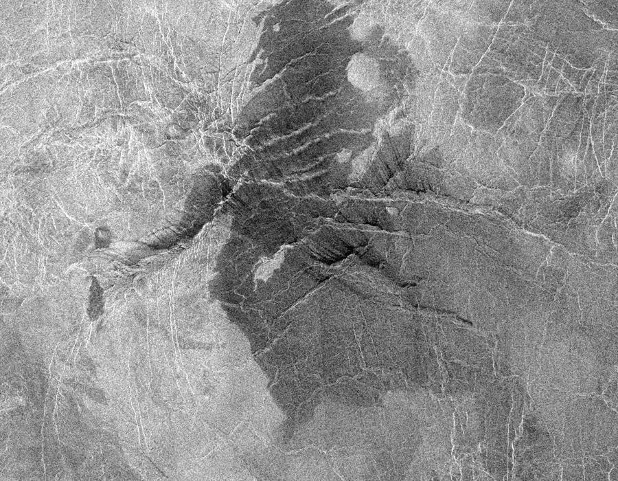 радарный сигнал. Темные потоки лавы снизу от полос имеют темный тон поскольку