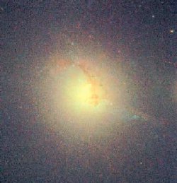 Более яркие точки в этом изображении соответствуют более высокой интенсивности ренгеновского излучения. Яркая линия снизу от центра показывает процесс конденсации и охлаждения - быстрой потери энергии через излучение ренгеновских лучей. В самом верху линии находится большая, ярко светящая ренгеновскими лучами галактика. По мере продвижения через газовое облако, мощное гравитационное воздействие скорее всего и создаёт этот плотный поток остывающего газа. После охлаждения, газ этого скопления будет использован как материал для формирования будущего поколения звёзд. Снимок слева, изображающий скопление в оптическом диапазоне, сделан орбитальным телеском Хаббл. |