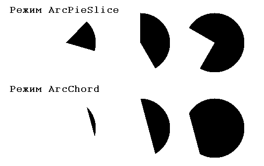 Функция XSetArcMode устанавливает стиль заполнения дуг при отрисовке их через графический контекст gc. Определено два режима: ArcPieSlice и ArcChord. В первом случае заполнение дуги происходит таким образом, что формируется сектор круга. Во втором заполнение дуги производится до прямой, соединяющей концы дуги. На иллюстрации приведены примеры заполнения дуг для этих режимов.