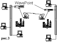 Используя выделенные машины для создания моста между сегментами сети, в этом случае в машину устанавливается два сетевых адаптера - Ethernet и WaveLan, и программное обеспечение обеспечивающее маршрутизацию пакетов (Novell Netware, Windows NT, OS/2, Unix-ы). Еще один способ - использовать WavePoint аппаратный мост, напрямую подключающийся к кабельной сети (AUI, BNC, RJ-45) (рис.3).