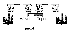 Еще одно полезное устройство - WaveLan Repeater. Аналог обычных repeater-ов для проводных сетей. Позволяет выстраивать цепочки из направленных соединений. Таким образом можно существенно повысить дальность связи и обойти нежелательные преграды (рис.4). Существует модификация этого устройства со встроеным сетевым интерфейсом.