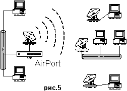 Существенное требование к соединению удаленных сегментов сетей - наличие "прямой видимости" между антенами. Это значит, что между точками соединения не должно быть больших преград - горы, здания, группы деревьев и т.п. Антены, поэтому, лучше распологать на верхних этажах зданий или на крыше. Еще одно полезное устройство - внешняя всенаправленная антена. Она позволяет создавать сети с конфигурациями "все-со-всеми" (рис.1) на расстояниях до 8км. При этом, необходимость "прямой видимости" остается.